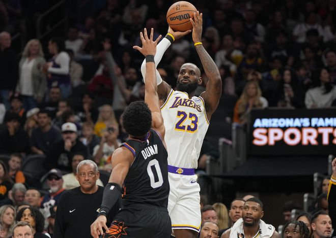 关键罚球三分之二+决定性盖帽!詹姆斯26+4,湖人险复仇太阳,东契奇29+6
